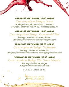 - Viernes 12 de septiembre, 19:00 horas – Bodegas Cayetano del Pino (bodega invitada: Ramón Bilbao). La cata estará dirigida por Yago Yerga, responsable de cultura y enoturismo de Cayetano del Pino, y Ángela Pelayo, enóloga y guía. Precio: 25€ por persona.