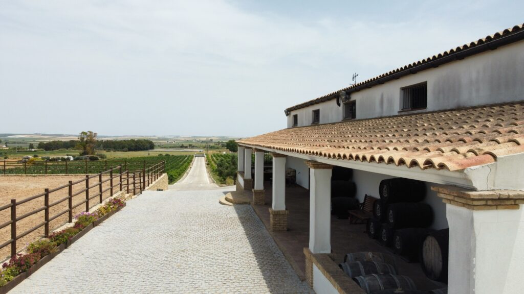 La finca combina su paisaje de viñedos con una edificación de arquitectura tradicional donde se ubican la bodega y espacios para recibir visitantes. El entorno permite contemplar el campo gaditano y la cercanía del mar, ofreciendo una experiencia auténtica de viticultura sostenible y de tradición familiar.