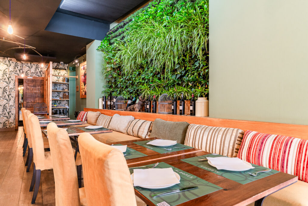 The essence of Albores cuisine is present in every corner of the restaurant: in the colours of its plates and the paintings that decorate its walls, or the hanging garden that evokes the harmony existing between nature and fresh food produce; the lighting that illuminates the dishes and, at the same time, creates a relaxed and inviting atmosphere; the different spaces, heights and types of tables and chairs so that diners can choose the way they wish to enjoy lunch or dinner. Everything has been carefully studied and integrated in a setting with a single aim in mind: that everybody should feel at ease.